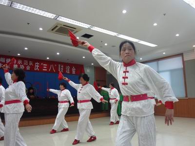 来自华罗庚公园、春风小区、九九宾馆等9个木兰拳健身点,欢聚在一起进行展示活动。亮丽的表演服更显得她们神采奕奕,英姿勃勃。各健身点都带来了最精彩的节目,有拳、有扇、有双圈、有舞蹈,一套又一套的,吸引了电视台的姑娘小伙子们热情地为她们摄像。