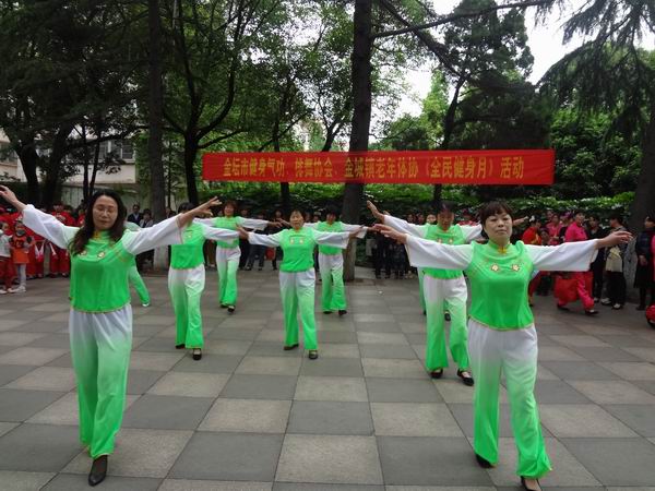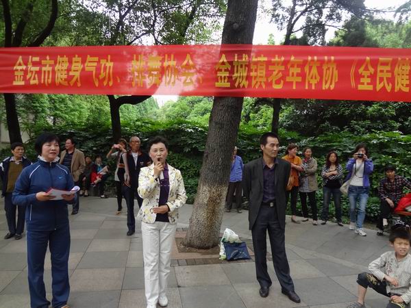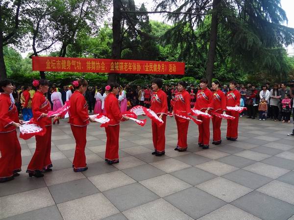 风景优美的金坛市华罗庚公园,热闹非常。金坛市气功协会、排舞协会、金城镇老年体协在这里共同举行了“全民健身月”活动。