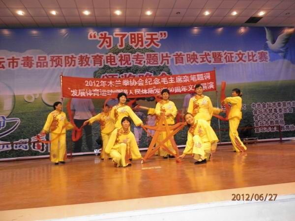 2012年6月27日中午,天陡降大雨,参加金坛市2012年木兰拳协会在华罗庚公园举办的“纪念毛主席‘发展体育运动,增强人民体质’题词发表60周年”活动的队员们,早已做好了演出和展示准备,无奈“望雨兴叹”。