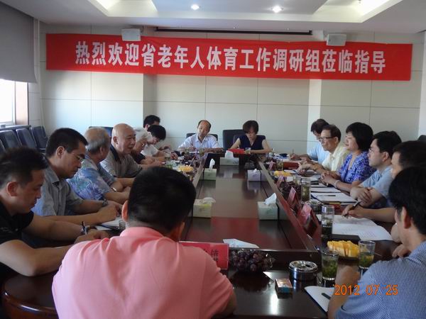 为检查、了解各地贯彻落实《省委省政府关于加快我省老龄事业发展的意见》和《省体育局关于进一步加强老年人体育工作的意见》的情况,江苏省老年体协副主席陈廉、江莉娟等在常州市老年体协副主席郑学书等陪同下于2012年7月25-26日来坛进行调研。
