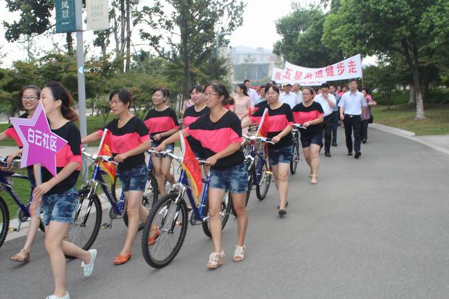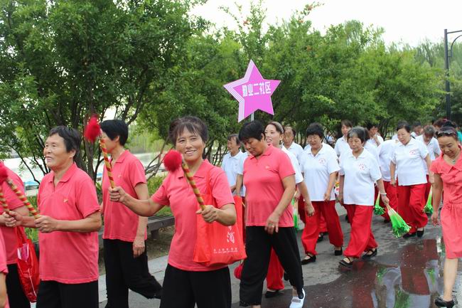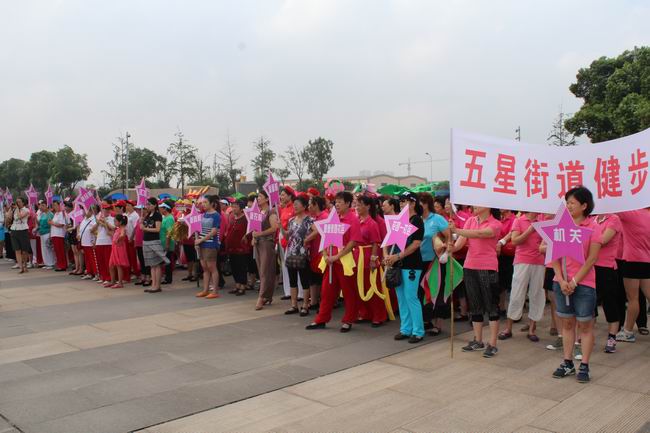 健步走队伍一行浩浩荡荡,场面壮观,由钟楼区五星街道21个村委(社区)组队参加,共有500多人。同时行进中的展示项目丰富,有腰鼓队、莲响队、功夫扇、秧歌队、军鼓队等表演。沿途设有内容丰富的健身活动,其中有7个街道组队参加的千人健身舞展示声势浩大,太极拳、抖空竹表演锦上添花。