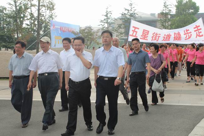 启动仪式上钟楼区五星街道办主任王行杰致词,副区长何海平讲话,薛锋宣布全民健身日启动仪式开始,并鸣枪发令健步走队伍出发。