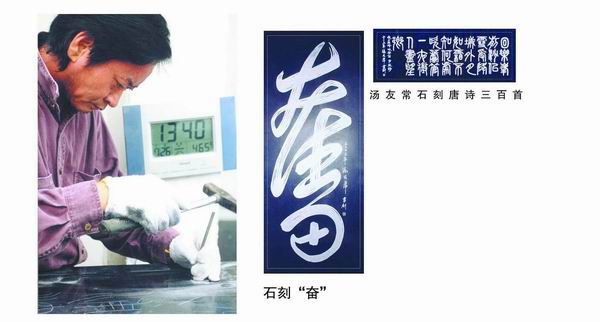 汤友常身上的故事三天三夜都说不完,在此略举一二。他临摹古画,两三年心摹手追,《清明上河图》中的一草一木全部烂熟于心,惟妙惟肖刻于铜板之上,5毫米厚的铜板,被他刻得金光闪耀。对于强权欺世,他是怒目金刚,横眉冷对,一切屑小的人物和行径难以逃遁。对于心仪女子,他敢于横刀夺爱。世间再难办的事,经过他的计算机大脑一过,马上灵光闪现,迎刃而解。他把苦痛视为享受,臂膀被猛犬咬烂,肌肉外翻,见者无不掩面,而他竟然大喜过望:“终于看到我充满活力的肌肉,太神奇了!”并吩咐医护人员缝针不用麻药。老汤的岁月,不是踩着钟表过,而是在钢迸石炸的轧轧巨响中度过的。在震耳欲聋的碎裂声中,在飞沙走石、粉石飞扬、四十多度的高温中,他手持切割机顽强创作,一干十天,数十天,每天连续工作十多个小时。在他认为“神圣”的创作时间里,如果有人不约而至,他必一顿怒斥。他常常用几碗腌菜面,对付辛苦创作中的一整天;他常年累月在荒郊野外的工棚里埋头创作,过着“野人”似的生活,吃井水,生火炉,种蔬菜,而乐此不彼。这么多年,他坚持不卖一件作品,对方出价再高,他都毫不动心。老汤在追求什么?他的精神支柱又是什么?答:给后世创造独一无二的艺术遗产。“一万年后,还能看到我的作品!”他坚信自己将流芳百世。