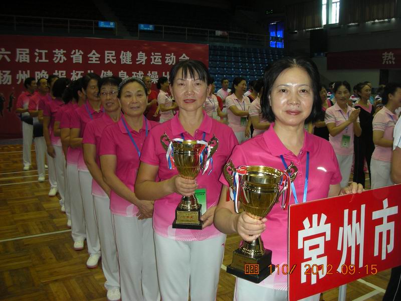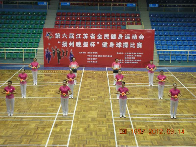 金秋扬州风光好,健身球赛聚英豪。江苏省老年人体育协会于2012年9月13日—16日在扬州市举办了第六届江苏省全民健身运动会“扬州晚报杯”健身球操比赛。共有12支代表队参加此次比赛,金坛市健身球操队第一次代表常州市参加比赛。