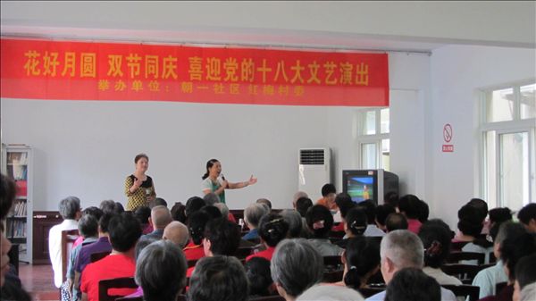 近日在红梅村委会议室,灯光明亮,彩旗飘扬,流淌着欢快歌声,荡漾着盈盈笑意。朝一社区和红梅村委联合举办的“花好月圆、双节同庆,喜迎十八大”文艺演出在这里举行,辖区近100名男女老少欢聚一堂观看演出。