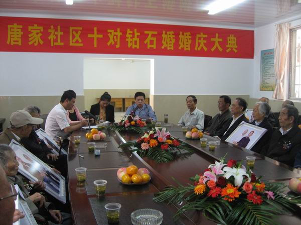 唐家社区总人口仅2023人,是该市社区中人口较少的社区之一。但为什么就有这么多钻石婚夫妻呢?参加的庆典的老人们一致回答了这个问题,他们告诉记者:“我们社区对老年人十分关怀,件件实事办到我们的心坎上,退休工资月月发,还帮我们办了医保卡,老年活动室建设得很气派,我们在里面读书、看报、健身和休闲,一天到晚喜洋洋。再加上子女孝顺,家庭和谐,所以越活越年轻了!今天为我们举办钻石婚庆,真是做梦也没想到啊!”