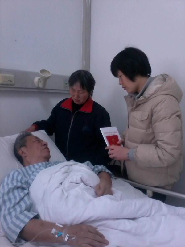 在病房里,谭书记详细询问了陈鋩新的病情以及身体状况,鼓励他战胜病魔、树立信心,祝愿他早日康复。陈鋩新听后激动地说:“我知道,社区的工作很繁忙,你们还专程来看望我,给我送来新党章,谢谢!非常感谢!”。