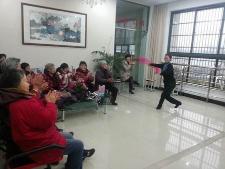 队员们与老人亲切的交流,先后表演了《绣金匾》《金丝鸟》《珊瑚颂》等20多首歌曲和戏曲,每一个节目结束都获得了老人们的热烈掌声。随后王阿娣老师的一支自编自演的舞蹈《太湖美》把活动气氛推向了高潮,老人们笑不拢嘴,连连称赞。最后,活动在大合唱《歌唱祖国》中落下了帷幕。