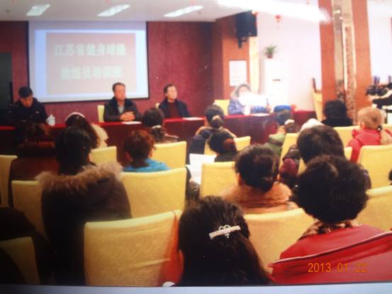 2013年江苏省老年人健身球操(第十套)教练员培训班于1月18日—21日在风景优美的扬州市举办,我常州市老年体协选派了健身球操基础较好的陈秀芳、李建婷(溧阳市)、洪丽霞(金坛市)、陈建萍(天宁区)、杭玉琴(钟楼区)参加了培训班。