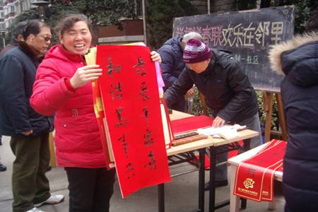 2012年2月6日下午,在金禧园小区大门广场上,常州钟楼区西二村一社区和常州邮政西新支局联合举办了“送福送春联 欢乐在邻里”的送春联活动,社区特意邀请了社区老年书画协会的书法家们为现场的居民群众挥毫泼墨,书写春联福字,吸引了众多居民驻足观看、索取,“玉兔贺新春 红梅开盛世”、“大地时时腾紫瑞 春风处处醉芳菲”,居民们争相把满意的春联与福字“请”回家。 在两个多小时的现场活动中,有百余幅春联、福字被到场的居民相中,大家高高兴兴地回家张贴,给新春佳节的家庭增添了喜庆的气氛。 (杨菁)