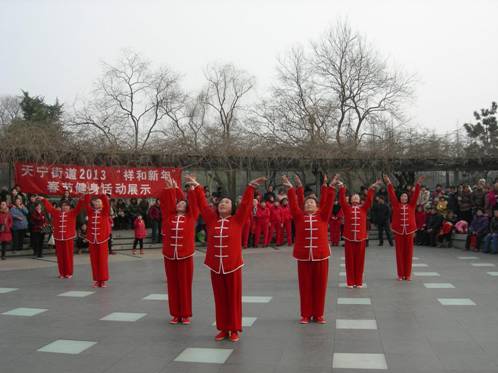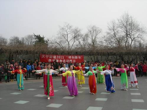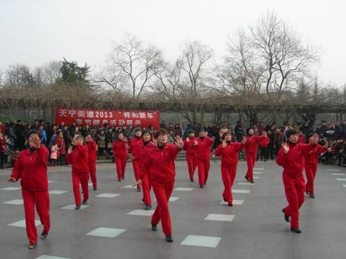 2013年2月13日 农历正月初四,明媚春光,常州市天宁区天宁街道老年人体协,在红梅公园水上舞厅,举办了“天宁街道2013‘祥和新年’春节健身展示活动”。6个社区的健身队,与街道老年人体协健身舞蹈队,近百名健身骨干上场参加了展示活动。