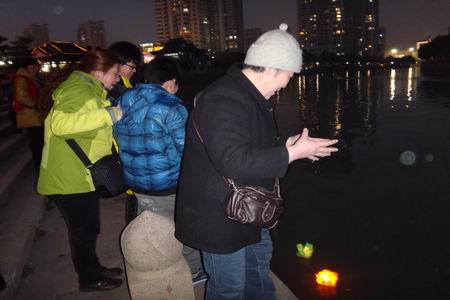 半个小时的游程后,游船来到了明城墙下。大家登上岸,点燃手中的莲花灯,小心地放入河中,莲花灯载承着人们满满的祝福越飘越远。