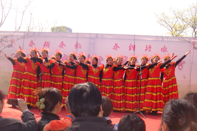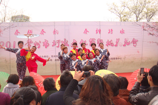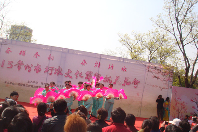 满树和娇烂漫红,万枝丹彩灼春融。为时一周的“春桃春韵 春到圩墩”2013常州市戚区圩墩文化•桃花节在戚区民众的大力支持和热情参与下,经过多方精诚合作,伴随精彩的文艺汇演,摄影、征文比赛颁奖等活动徐徐落下帷幕。3月30-31日,戚墅堰区老年大学、各文体社团、戚区东方戏曲协会提供了多元化、多层次、多品味的精神文化大餐,戚区教育文体局副局长金辉、戚区教育文体局文体科科长董彩凤、戚墅堰区各街道、社区的居民2000余人在圩墩遗址公园广场观看了文艺专场演出。