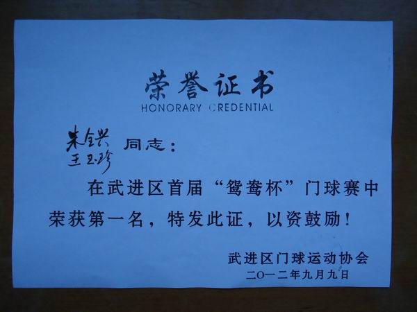 去年,湟里镇退教分会的退休教师朱全兴和王玉珍夫妻俩在武进区首届“鸳鸯杯”门球赛中荣获第一名。不光为湟里镇退教分会争得了荣誉,而且为武进区退教协会争光。并且,他们还代表武进区参加江苏省的门球比赛。