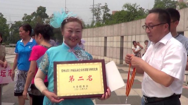 上午8点30分,常州市天宁区红梅街道天娇舞蹈队参加了此次比赛。舞蹈队队长钱佩芳老师带领10余名老年舞蹈队员,身着湖水般蓝蓝的演出服,手执彩色扇子,在海派秧歌《紫竹聆风》的音乐声中,翩翩起舞,舞姿优美,动作轻柔,把具有观赏性、娱乐性、时尚性于一体的第五套健身秧歌规定套路发挥得淋漓尽致,赢得了全场一片掌声。在此次比赛中,取得了规定套路比赛二等奖和个人道德风尚奖的好成绩。