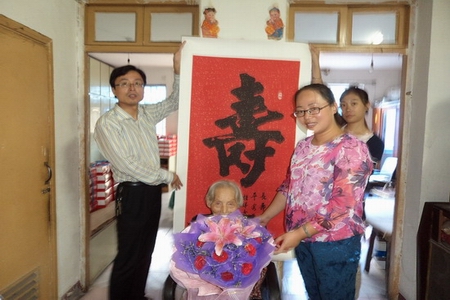 2013年9月30日上午九点,钟楼区勤二社区书记陈叶带着社区工作人员一起为社区百岁老人周婆婆过寿,老人穿戴整洁大方、在儿女、老相邻、社区工作者的祝福声中度过了自己的百岁生日。