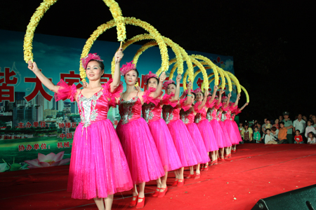 晚上7点,芦墅公园广场上灯火璀璨,动感的开场舞拉开了晚会的帷幕,阿姨们用她们健美的身姿展示绝不输给年轻人的风采,接下来表演的是男生萨克斯独奏《城里的月光》,机一社区的“明星”钱孟林老先生趣谈常州方言,幽默诙谐的表达引来台下的阵阵欢笑,晚会还邀请了常州市一级演员吴小英演唱了锡剧《珍珠塔》选段,秀乾截拳道的石秀全师傅带领他的弟子们表演为观众展示了截拳道功夫表演,最值得一提的是《物管诙谐三句半》节目,表演者由芦墅广景苑小区业委会主任、社区干部、鸿基物业代表、居民代表组成,旨在传递和谐物管对居民生活带来的便利与美好,此外,舞蹈《青果巷》、《动感地带》、《很远很远的地方》、《梅花影》、《莲花落》,阿姨们绚丽的服装、曼妙的舞姿,如痴如醉,台下不时爆发出热烈的掌声。
