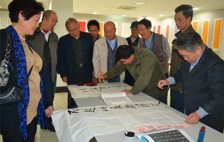 近日,溧阳市文化艺术中心大厅内“临帖书法大展”正在热展中,记者来到展厅,只见人流如潮,笑语声声,特别引人注目的是70岁的洪景萱和65岁的施荣贵正在现场临帖书法。那刚劲有力、熟练的笔法,实在令人惊叹,赢得了参观者的啧啧称赞。