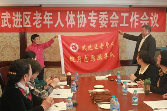 2014年4月9日上午,在武进区湖塘镇双塘桥下的绿城玉兰广场,武进区老年人体育协会组织召开了老年人健身志愿服务队成立会议。武进区体育局分管群众体育的陈昭锦和叶波两位领导出席会议。参加会议的有全区热心老年体育工作的拳、舞、球、操等专委会的领军人物20余人。会议由老体协常务副主席江光迅主持,志愿者代表周莲娣同志首先发言。她表示志愿者应有奉献、友爱、互助的志愿服务精神和社会责任感,不以物质报酬为目的,用自己的时间、技能等资源自愿为他人提供服务和帮助。江光迅同志说,成立志愿服务队是为了聚集和整合资源,充分发挥骨干作用,推动全民健身活动的蓬勃发展。也是贯彻十八届三中全会精神,响应区政府建设大爱武进的号召,把武进建成全民健身示范单位,也顺应了民众的需求。最后体育局领导做了主要讲话,老年体协主席顾培华为志愿服务队授旗。至此,会议圆满成功。