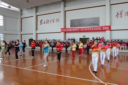 台上老师不厌其烦的一个动作一个动作的示范讲解,台下百名学员也非常珍惜这难得的培训机会,听得仔细,跳得认真,课后还不知道疲倦的反复练习着。经过短短的一天半培训,学员们均熟练的掌握了成套的动作,并在最后一天的考核中用出色的表演回报了老师的辛苦,同时也大大提升了自己的技能。