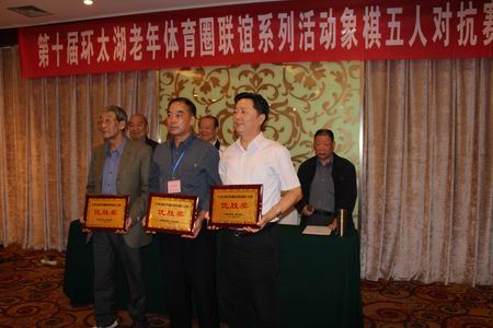 本次象棋五人对抗赛是今年系列活动的第一项,共有来自嘉兴、湖州、苏州、无锡、常州五城市30余名老年象棋爱好者参加。经过两天的比赛,无锡市、苏州市、湖州市代表队发挥较高水平获得前3名(优胜奖);常州市、嘉兴市代表队获得优秀奖。常州市老年体协主席薛锋、常务副主席郑学书给各单位颁发了奖牌,并祝愿各位老年朋友在常州过得愉快。