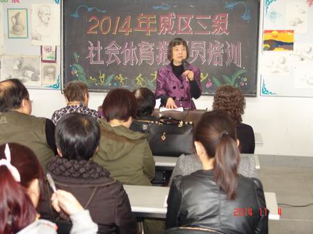 本次培训由戚区文化馆办公室主任沈蓓虹主持,共有三个议程。一是戚区教育文体局文体科科长董彩凤发表讲话。她指出,我区各级社会体育指导员热心从事社区体育指导工作,乐意为群体事业服务,具有较高思想道德素质和业务能力,有一定的组织和指导能力,通过各级社会体育指导员的共同努力,“全民健身日”活动家喻户晓、人人皆知,社会体育指导员已成为全民健身和群众体育工作的中坚力量,是全民健身工作开展的动力源泉;二是戚区文化馆办公室主任沈蓓虹讲解社会体育指导员的概念、特点和社会作用及科学健身知识要素等,培训内容具体实用,指导性和可操作性强;三是进行理论考核。通过理论考试,广大学员知晓了《普通人群体育锻炼标准》及测试方法,开拓了视野,增长了知识。