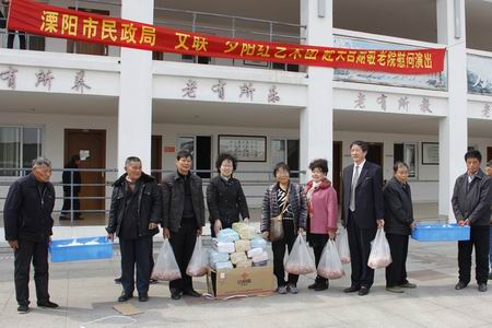 近日溧阳夕阳红艺术团三十多名团员带着事先准备好的70多斤猪肉、70多斤饺皮和120条毛巾乘坐一辆大巴专程来到溧阳天目湖敬老院慰问敬老院里的一百多位老人们并为他们表演了精彩的文艺节目。