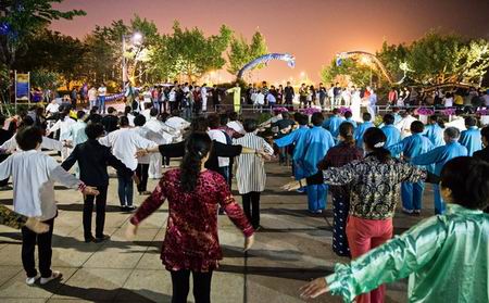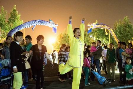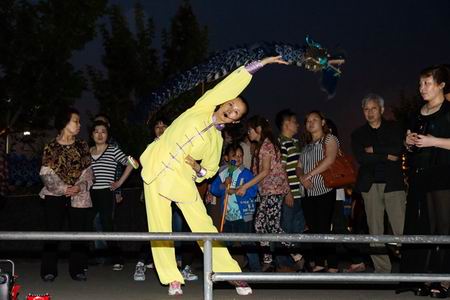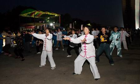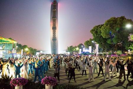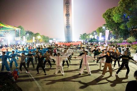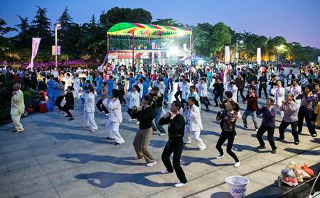 2015年5月1日晚上,天宁区青龙街道老年体协在紫荆公园旱喷广场准时开始健身气功广场志愿教学活动,这次教学内容是北京体育大学研发的“体育养生功前热身术”和健身气功新功法“导引养生功十二法”,青龙街道各村社区广大健身气功队员前往参加教学活动,同时本次教学活动还吸引了来自武进区、新北区、钟楼区、戚墅堰区、天宁区其他街道的健身气功队伍一同习练。