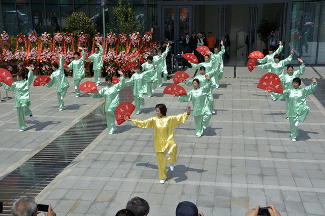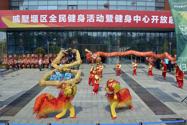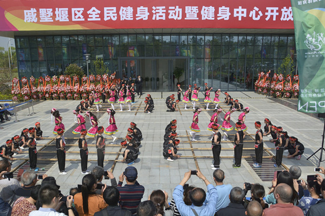 启动仪式后,来自三个街道和两所小学的演出队伍轮番上阵,进行群体活动表演。丁堰小学根据校本多民族生源特点创编的竹竿舞首先上场,学生们随着音乐,在竹竿间灵巧地跃动,竹竿有节奏、有规律地一开一合,场面煞是壮观。潞城小学的特色足球操动作整齐划一,学生们在快乐运动中展示了良好的校园精神风貌。来自街道的功夫扇、健身秧歌和腰鼓表演均展示了戚区民众积极向上的精神风貌。很多群众被展示活动吸引,不时献上热烈的掌声。表演结束后,大家参观了健身中心。