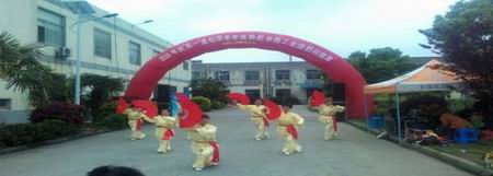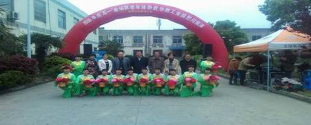 4月25日,为庆祝国际“五.一”劳动节,金坛区老年体协刘冬根主席率健身团队送文化到华胜村民营工业园。