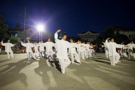 之前,齐刷刷来到三里村五家村健身广场。原来,他们是来排练太极拳、功夫扇项目。在音乐声中,只见他们一个个身手矫健、功夫不凡,时而高探马,时而白鹤亮翅、时而高抬腿,时而仆步下势,一招一势都是训练有素、非常整齐。