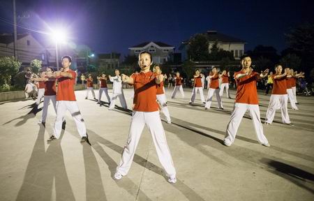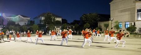 7月21日傍晚,青龙街道三里村五家村健身广场上静悄悄,以往这个时段来锻炼的居民今天都没来,原来是因为天气炎热,居民们为了避暑而暂停夜间运动了。然而7点钟不到,一批身着红色T恤和白色长裤的健身气功爱好者陆续前来,有骑自行车的,有开电屏车的,有步行的,也有开汽车的。只见他们到了健身广场上,在领队的一声令下,迅速排好队伍,开始习练健身气功八段锦和导引养生功十二法,跟着音乐一招一势象模象样,参加人员有50后、60后、70后、还有80后、90后。
