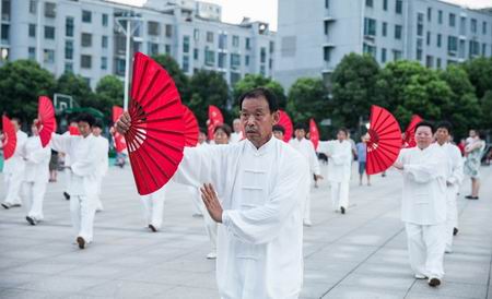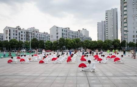 在屠洪刚铿锵有力的《中国功夫》音乐声中,只见这支太极展示队员身穿白色太极服,手拿红色功夫扇,开始有模有样地练起《太极功夫扇》套路来了,时而马步开扇,时而转身穿梭、时而抬腿架掌,时而歇步开扇,每一招都是虎虎生威、气势逼人,充分展示了中国功夫的霸气与神韵。一会儿,
