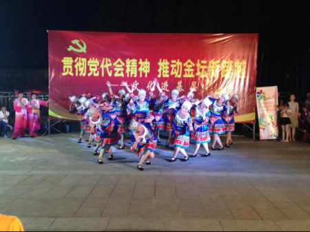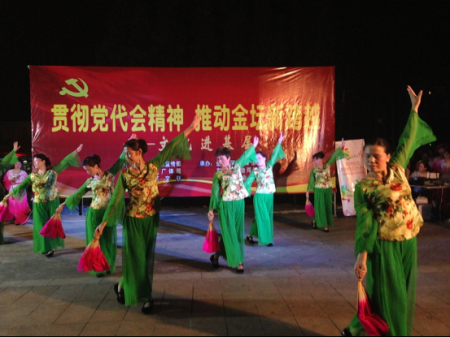 8月8日晚来自排舞协会15个健身点200多名会员齐聚在金河社区峨嵋菜场健身广场,参加由中共金坛区委宣传部、金坛区文广体局、金坛区文联主办的“贯彻党代会精神,推动金坛新跨越”文化进基层全民健身日健身展示活动。扇舞《我的祖国》、排舞《金坛子》、扇鼓舞《金沙鼓韵》、等12个精彩文艺演岀和党代会知识问答的现场互动,吸引了许多市民驻足观看,为此金坛电视台也为本次活动进行电视采访。
