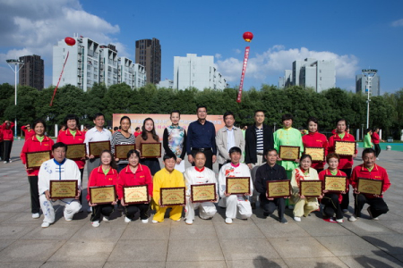 在裁判工作组计分、准备获奖人员荣誉证书时段,全场依旧热情高涨,青龙街道亚新村社会体育指导员吴荫带领青龙街道200多位健身气功运动员在广场上表演了手语歌《习主席寄语》、《感恩一切》、《中华民族》,让本次群众体育活动又平添了满满的正能量文化氛围,让所有参赛队员和前往观摩的居民群众升起了一份浓浓的民族情怀、爱国情素和一颗赤诚的感恩之心,感谢党和政府如此重视全民健身群众体育活动,感谢各级领导的关心支持,感谢各单位通力协助。