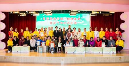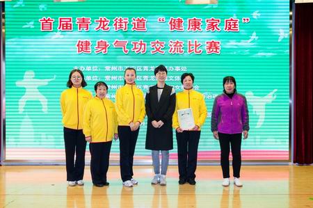 本次比赛功法有六字诀、八段锦、导引养生功十二法、大舞、太极养生杖五套功法,来自青龙街道三里、亚新、青南等社区和青龙中心幼儿园共14个家庭参加了角逐,决出了一、二、三等奖、最佳人气奖、优秀奖、优秀组织奖。一等奖获得者是青南社区的丁来娣家庭和青龙中心幼儿园紫云分园的罗琳家庭,丁来娣带了12岁的孙子、侄媳妇一起参赛,比赛功法是太极养生杖,真是的一招一势,有板有眼。罗琳带着女儿罗星艺参加了六字诀的比赛,5岁的罗星艺在台上每个动作都一丝不苟,她的淡定从容,让每一个观众都为之惊叹,小小年纪,就能有如此的专注力,真是不简单,一看就是花了很多功夫来习练健身气功。三里村的李国清家庭获得二等奖,李国清从青龙街道办事处劳动服务所退休不久,他的妻子骆杏英已参加过全国和省级健身气功比赛,给李国清很多帮助和指点,带着他一同走上了习练健身气功的道路。亚新村的徐清、黄春娟夫妇带了28岁的外甥毕志杰参加了八段锦的比赛,也获得二等奖。毕志杰是健身气功省比赛队伍中的一枚耀眼的新星,来自常州市天宁区职工创新创业基地——天宁区青年创客服务中心,担任总经理助理,他在单位工间操时间开展健身气功志愿教学活动,把六字诀、八段锦、导引养生功十二法等功法都教给了年轻的同事,让同事都喜欢上了健身气功。最让人过目不忘的是三里村委五家村2号戴琴娣家庭,6个参赛队员,来自五个有血缘关系的亲戚家庭,有母女、姐弟、祖孙、姑嫂、姨甥,是血缘关系最多的一个家庭,他们比赛的功法是六字诀,有的队员习练健身气功已有7年功龄,有的刚开始几个月,但他们有一个共同特点,就是非常认真对待这次比赛,经常在一起习练,纠正动作,力求规范,不但强健了身体,还增进了亲情,真是其乐融融……参赛家庭纷纷表示非常喜欢参加青龙街道“健康家庭”健身气功交流比赛,希望明年还能有机会来参加这个比赛,而且还要多带几位家庭成员来参赛获奖,希望街道能每年举办“健康家庭”健身气功交流比赛,为全民健身提供一个非常好的展示舞台,从而能更加有力地促进健身气功在千家万户落地生根。参赛队员夏琴华这样说“推广健身气功,是一件功在当代、利在千秋的大好事,我们会一直习练健身气功,积极参加各种交流展示活动”。