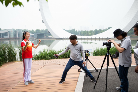 在功法展示之前,队员们先演唱了正能量手语歌《国家》,“我爱我的国,我爱我的家,我爱我国家……国与家连在一起,创造地球的奇迹”,顿时让每个人家国情怀油然而生,你看他们的脸上,一个个洋溢着无比幸福与自豪的喜悦之情。5:50左右,随着导演一声令下,这支训练有素的队伍在优雅的萨克斯《天边》音乐声中,在紫荆公园的湖中水岸悠悠然地开始展示健身气功新功法.马王堆导引术。夏日的微风拂在脸上,就像婴儿稚嫩的小手轻轻地抚摸着他们的脸庞;天上的朝霞丝丝缕缕,犹如美丽的真丝织绵缎一般绚烂多姿令人陶醉;岸边的菖葡、水草、黄色紫色的小花仿佛也能借着微风吹过来这优美的音乐,一起随风荡漾摇摆舞动起来;更有水里的小鱼儿时不时地腾空飞跃探头探脑,好像是要看清楚这群可爱的健身气功达人到底练的是什么功法?哇,在悠扬的音乐声中、在大自然的怀抱里如此自在地习练健身气功,感受着风儿的抚摸,闻着公园里植物的清香,自由穿梭在功法的各个招势之中,简直就像是天上的神仙出游人间,此情此景,让每个健身气功队员全然沉醉其中,真正享受练功的乐趣……在水的那边木栈道上,只见一群来晨跑的居民,停下脚步拿起手机,拍下这仙境一般的美妙场景,并连连称赞这支健身气功队伍整齐划一的动作和令人心生羡慕特别饱满的精、气、神。头顶上方,无人拍摄机时高时低,时而拉近,时而推远,围着这群健身气功达人360度拍了个够。导演更是精益求精,让队员们连续展示了几遍,留给摄制人员足够的拍摄时间。