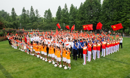 8:00过后健身气功队伍来到公园大草坪上与机关、社区、企业、学校队伍汇合,组成了一个大方阵,手举小的国旗、党旗,一起欢唱《歌唱祖国》,喊起响亮的口号“不忘初心跟党走,牢记使命永奋斗”,他们的声音是如此宏亮清澈,直上云霄,唱出了天宁经济开发区人民见证新中国成立70周年取得伟大成就的自豪之情和永远一心一意跟党走的坚定信心。