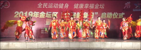 在金坛区文体广电和旅游局、体育总会领导的演讲下,活动正式开始。首先表演的是指前镇百花健身协会的原创舞蹈《欢舞盛世》,那催人奋进的音乐、优美的舞姿、稳健的台风,无不展现了在中国共产党的领导下,新一代富裕起来农民的精神风貌。
