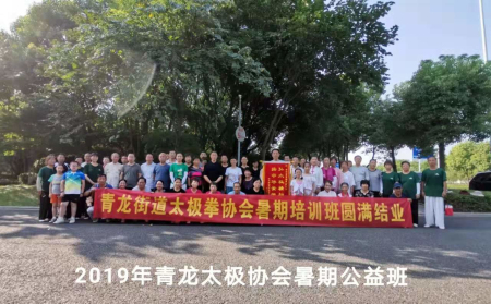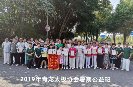 今年暑假期间,天宁区青龙太极协会在钱徐英会长及十三位教练的带领下,在紫荆公园义务开办了太极拳、剑、棍、扇及学生假期班,太极初级班、提升班等多种形式的健身活动。参加人数有一百六十多人,形成了一支强大的队伍。人员仍逐步增加,并拥有十多人的教练队伍,各个拳艺高超。学员们特意送锦旗给钱徐英会长,感谢他的义务教学这是奉献精神,为普及全民健身活动作出无私的贡献,弘扬推广中华优秀传统太极文化。