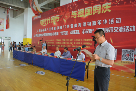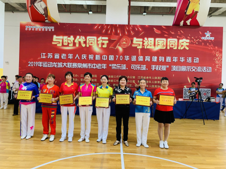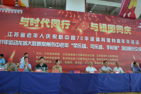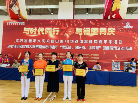 2019年9月25日,由常州市体育局、常州市老龄办、常州市老年人体协共同举办以及6个辖市、区老年人体协协办的“与时代同行、 与祖国同庆”江苏省老年人庆祝新中国70华诞体育健身嘉年华常州分会场暨2019年运动龙城大联赛常州市中老年人“柔乐球、可乐球、手杖操”项目展示交流活动在常州钟楼奥体中心隆重举行。