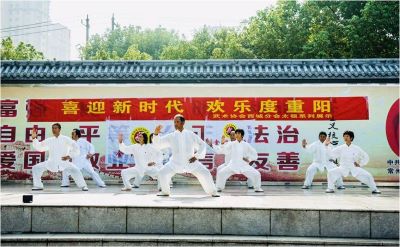 10月17日,金坛区武术协会西城分会在青年广场,举办了欢度重阳节太极文化展示活动。西城分会12个健身队,近200人参加了活动。 展示活动以祖国你好的舞蹈开场,依次集体表演了24太极拳,32太极剑,观音佛拳,木兰剑,太极扇,8式太极拳,舞蹈高天上流云,陈式精要18式,36式太极刀。然后个人展示了陈式56式剑,24太极拳,观音佛拳,雨中太极伞。 合计17个节目,表演了近2小时,会员情绪高涨,有的老太太,练了二十多年太极拳,七、八十岁在台上太极拳招式如行云流水,引发阵阵掌声。(钱罗生)