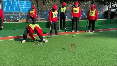 共有30名门球女将组成4支门球队进行了循环比赛。她们身着红色服装,预示着门球事业的红红火火,成为一道亮丽的风景线。