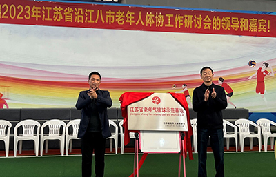 7、11月25日,溧阳市天目湖镇八连片室内灯光塑胶气排球场地,由江苏省老年人体协在全省率先下发函文,同意设立为省级项目基地,并被授予“江苏省老年气排球基地”光荣称号。11月28日在天目湖镇老年体育活动中心举行授牌(揭牌)仪式,江苏省老年人体协常务副主席朱维宁、副主席兼秘书长孙海连出席并分别作了热情洋溢的讲话,授牌仪式由常州市老年人体协主席任小玉主持。