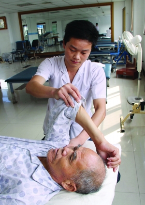 ▲ 老有所医 全区养老机构均有康复服务,实现边养老边康复,确保老年人身体健康。图为圩塘康乐中心医务人员为老年人做康复保健.