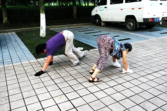 近日的一个早上,在江苏省溧阳市政府广场,看到不少行人正在停步惊奇地目睹着两位老太倒立爬行。
