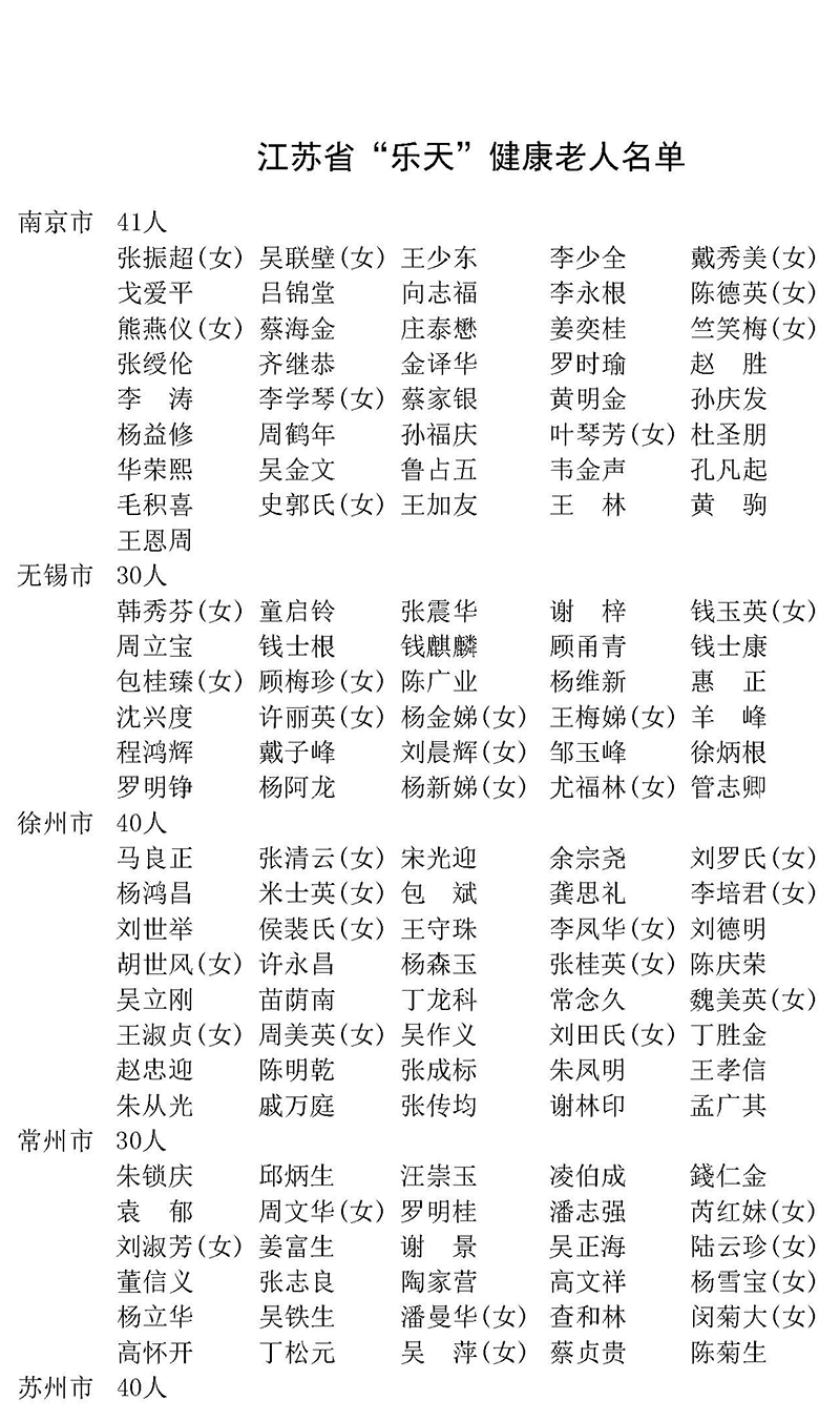 近年来,在各级党委、政府的高度重视下,全省各地以“三个代表”重要思想为指导,全面贯彻科学发展观,认真贯彻落实党和政府的老龄工作方针,积极应对人口老龄化,弘扬中华民族敬老、爱老、助老的传统美德,大力开展老年人体育健身活动,积极倡导健康、文明的生活方式,不断提高老年人健身意识和健康水平,涌现出一批“老有所为,老有所乐”的健康老人,经各地审核推荐,决定授予469位同志为江苏省“乐天”健康老人荣誉称号,并在2012年江苏省老年人体育节期间予以表彰。