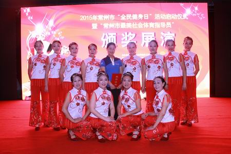 8月7日下午,2015年常州市“全民健身日”活动启动仪式暨“常州市最美社会体育指导员”颁奖展演在常州奥体中心举行。我街道的王阿娣荣获“常州市最美社会体育指导员”称号。副市长方国强出席活动并为10位获得常州市最美社会体育指导员称号的指导员颁奖。活动现场我街道荷之悦舞蹈队展示了舞蹈《中国结》。