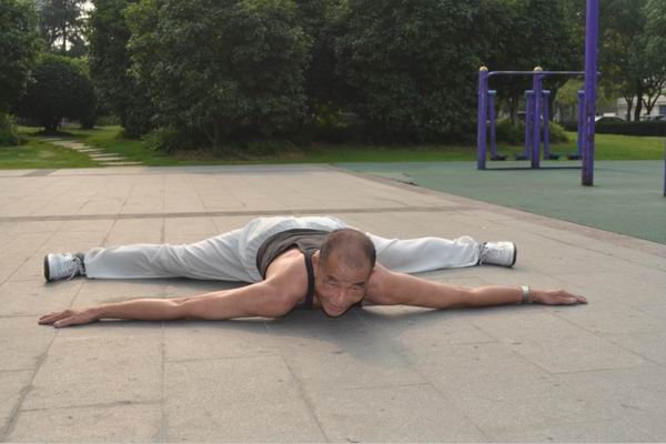 在溧阳市人民广场的东侧凉亭里,经常能看到一位七旬老人正在施展杂技的技艺。一会儿双手扣紧脚跟,双腿压向双肩两侧,脚尖着地;一会儿一个劈叉,两腿撇成一字;一会儿一脚金鸡独立,另一只脚朝天举过头顶... ...这位老汉柔弱无骨的功夫赢得了阵阵喝彩。