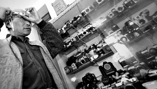 身为相机维修大师傅,老毛也“顺带便”搞搞相机收藏,这成了他“牛”的第二个原因。“嘿嘿,你看看我左边的橱窗,里头的货色常武地区独一无二!”现在,老毛手里稀罕玩意真不少:德国产的石库门福伦达天线机,上快门连卷片,据说当初这架相机在日本可以换一辆轿车,还有早期柯尼卡I、II、III,日本战败后专为美国生产的仿徕卡Canon,1919年生产的最早的柯达相机,可平视俯视取景的理光机单反机,美国的“水星”机,东德生产的早期康太克斯相机,德国产的“米诺克斯”间谍机……“不是吹的,我收藏的相机,只只维护、保养得很好,每一只都能拍出靓照来。”前几天,还有一位常州知名摄影家从他那里借了一只老相机去拍静物呢。但是这些相机在老毛夫人嘴里却是:“一堆垃圾。”老毛可不这样看:“哪里是垃圾?都是宝贝!她不懂的。”